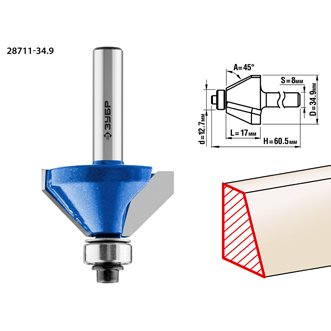Фреза кромочная калевочная(фасочная) No9, D= 34,9мм, рабочая длина-17мм, угол наклона-45 градусов, хв.-8мм, d-12,7мм, ЗУБР Профессионал