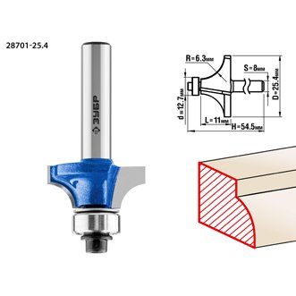 Фреза кромочная калевочная No1, D= 25,4мм, рабочая длина-11мм, радиус-6,3мм,хв.-8мм, d-12,7мм, ЗУБР Артикул: 28701-25.4