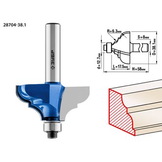 Фреза кромочная калевочная No8, D= 38,1мм, рабочая длина-15,2мм,радиус-6,3мм, хв.-8мм, d-12,7мм, ЗУБР