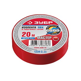 Изолента красная, ПВХ, не поддерживающая горение, 6000 В, 19мм*20м "МАСТЕР", ЗУБР Артикул: 1234-3_z02